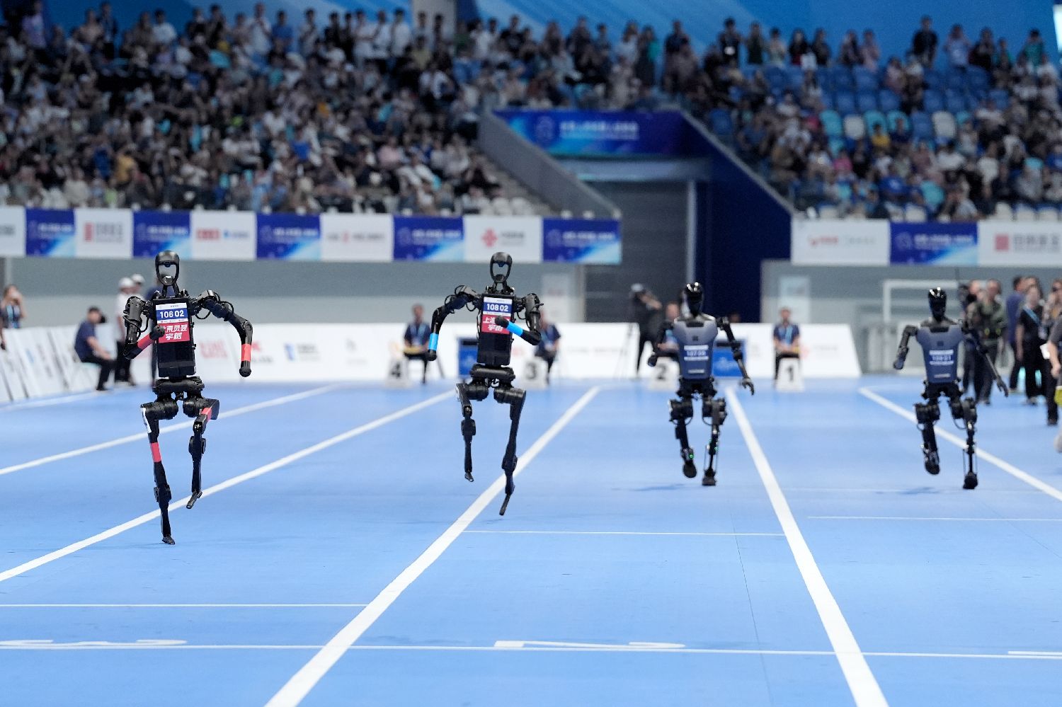 8月17日,2025世界人形机器人运动会100米决赛在北京国家速滑馆(冰丝带)举行,以AI自主操控的天工机器人(右二)以21秒50的成绩获本次比赛冠军。(图片来源:中新社)