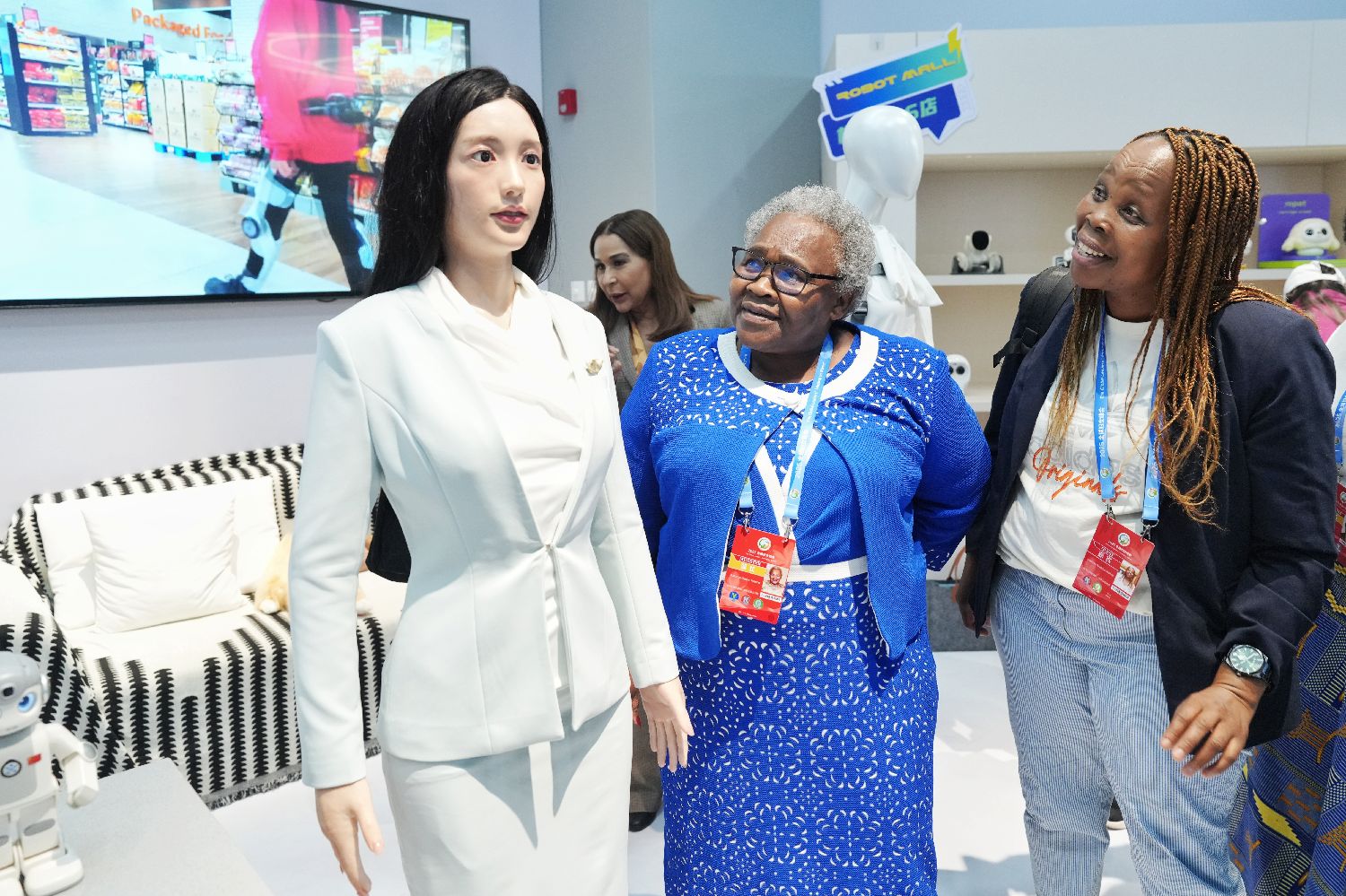 10月14日,参加全球妇女峰会的部分嘉宾参访北京机器人大世界。图为机器人4S店的家政服务机器人吸引嘉宾。(图片来源:中新社)