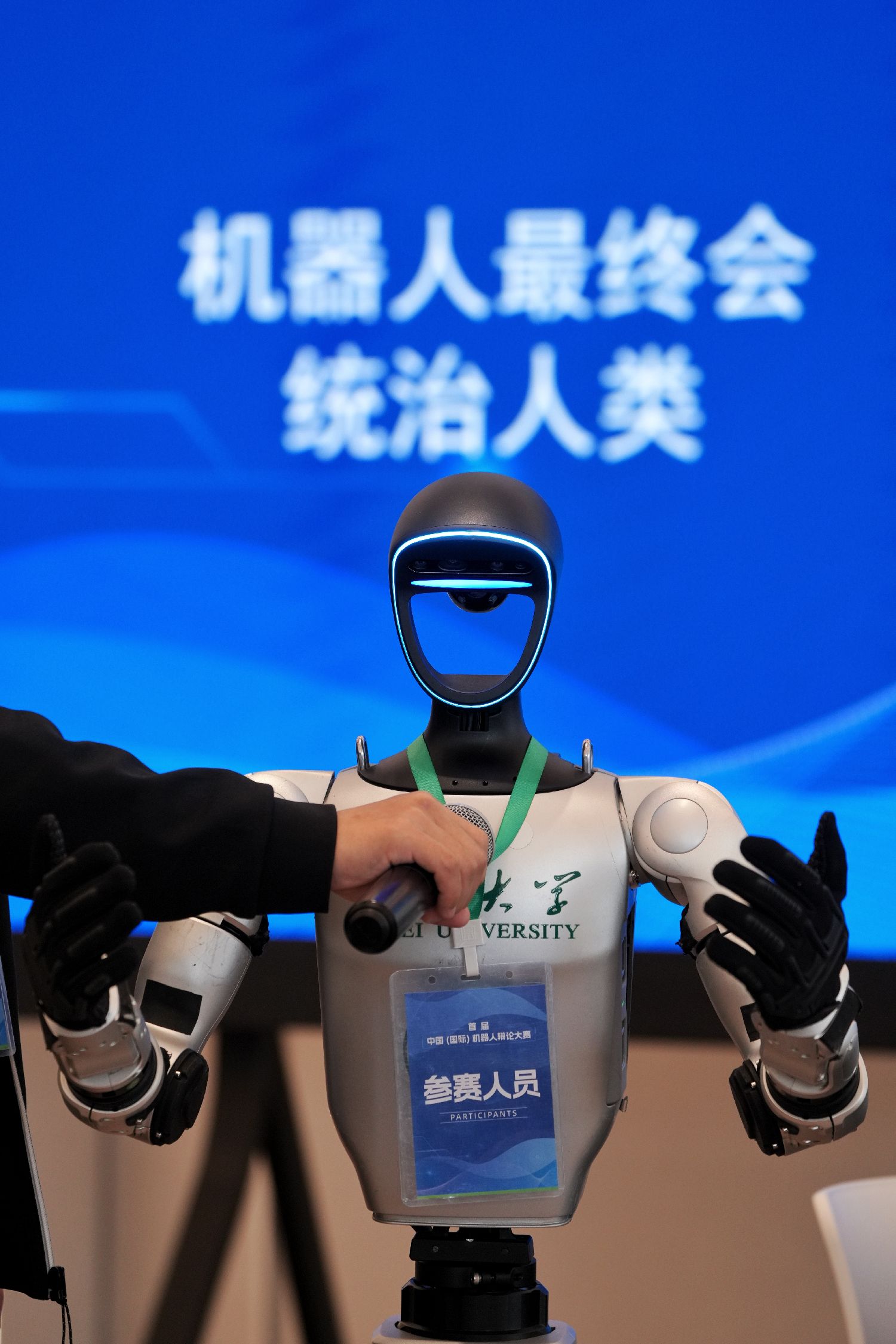 11月9日,首届中国(国际)机器人辩论大赛决赛在北京亦庄举行。图为湖北大学队机器人选手在冠亚军争夺赛中作为正方发表观点。(图片来源:中新社)