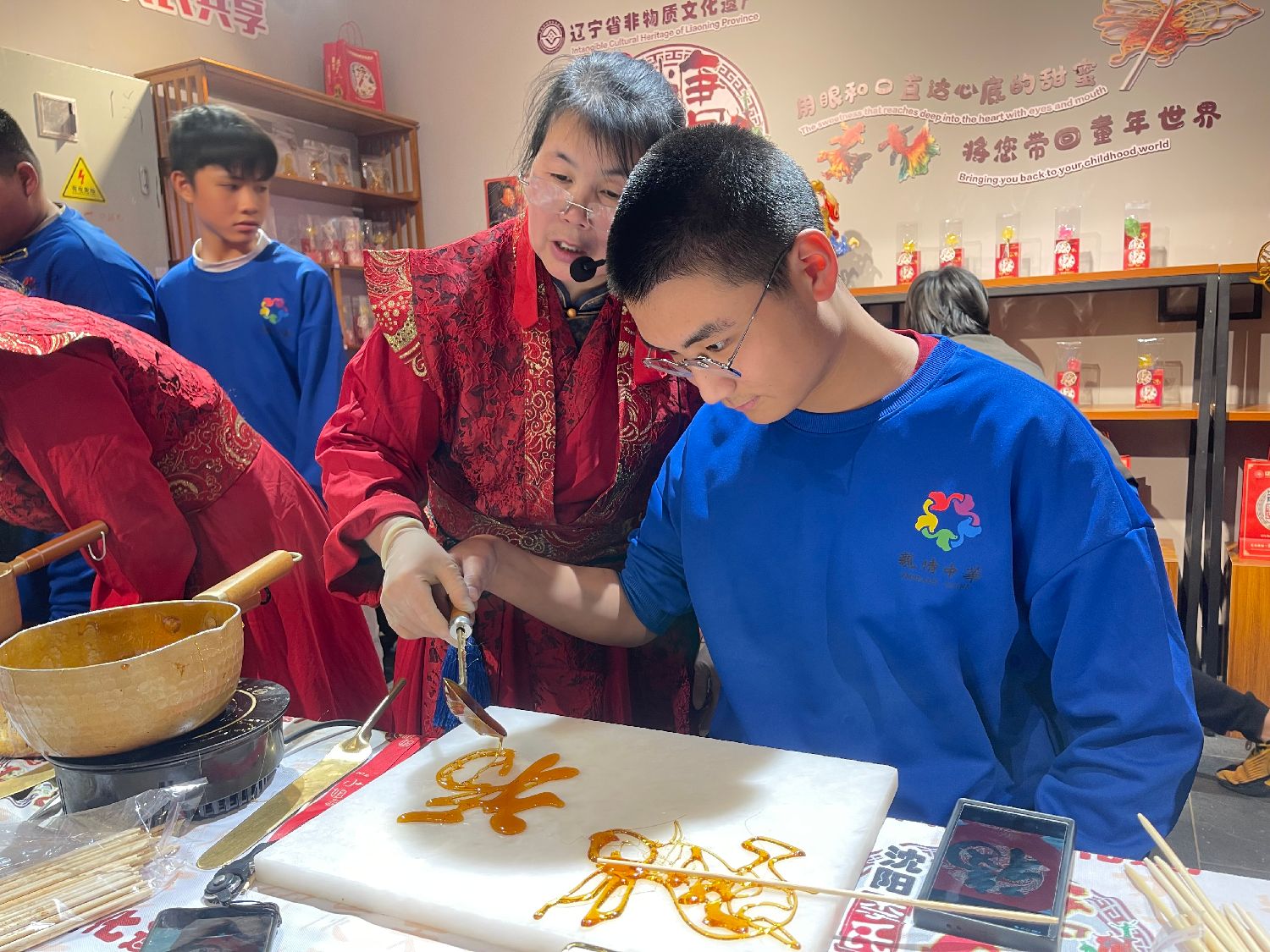 12月27日,华裔青少年营员体验传统糖人、糖画。(图片来源:中新社/沈阳师范大学供图)