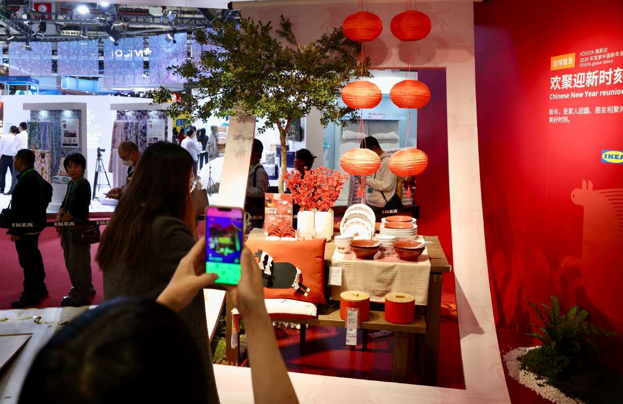 2025年11月6日,第八届中国国际进口博览会正在上海举办,观众在消费品展区宜家展台拍摄2026中国新年系列家具。(图片来源:中新社)