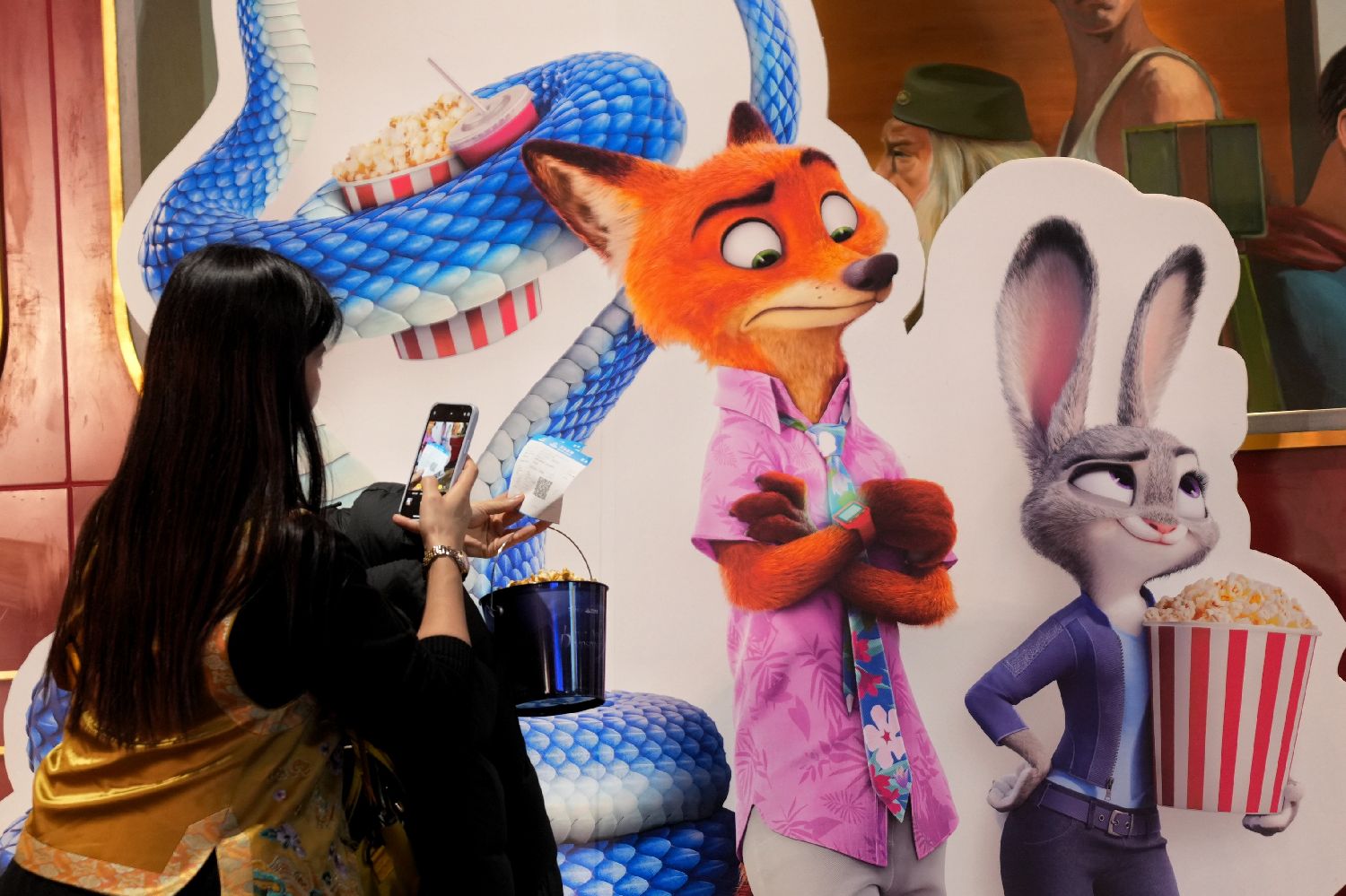 2025年12月7日,市民在北京一家影院持票根打卡《疯狂动物城2》艺术装置。(图片来源:中新社)