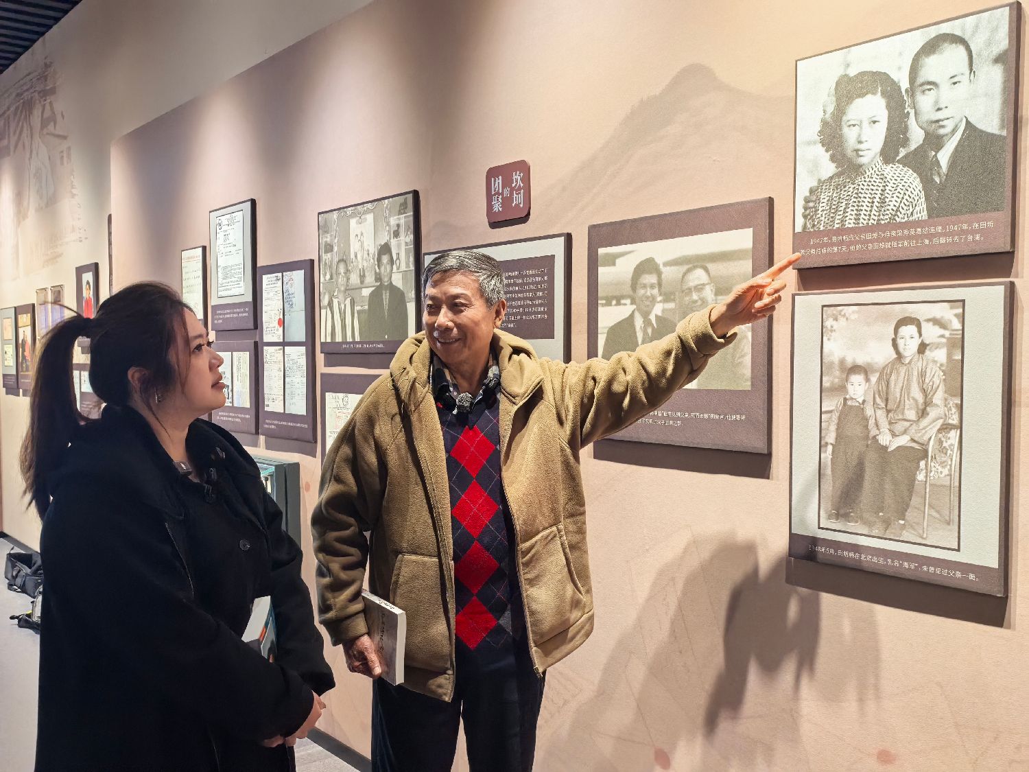 1月9日,“两岸信使”田圻畅(右)在中国闽台缘博物馆讲述自己的经历与两岸寻亲故事。(图片来源:中新社)