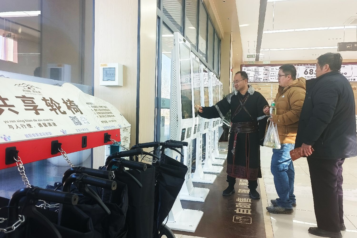 1月12日,银川西夏陵景区内,工作人员协助游客进行线上购票,景区各处还设有共享轮椅取放点,方便老年游客出行。(图片来源:中新社)
