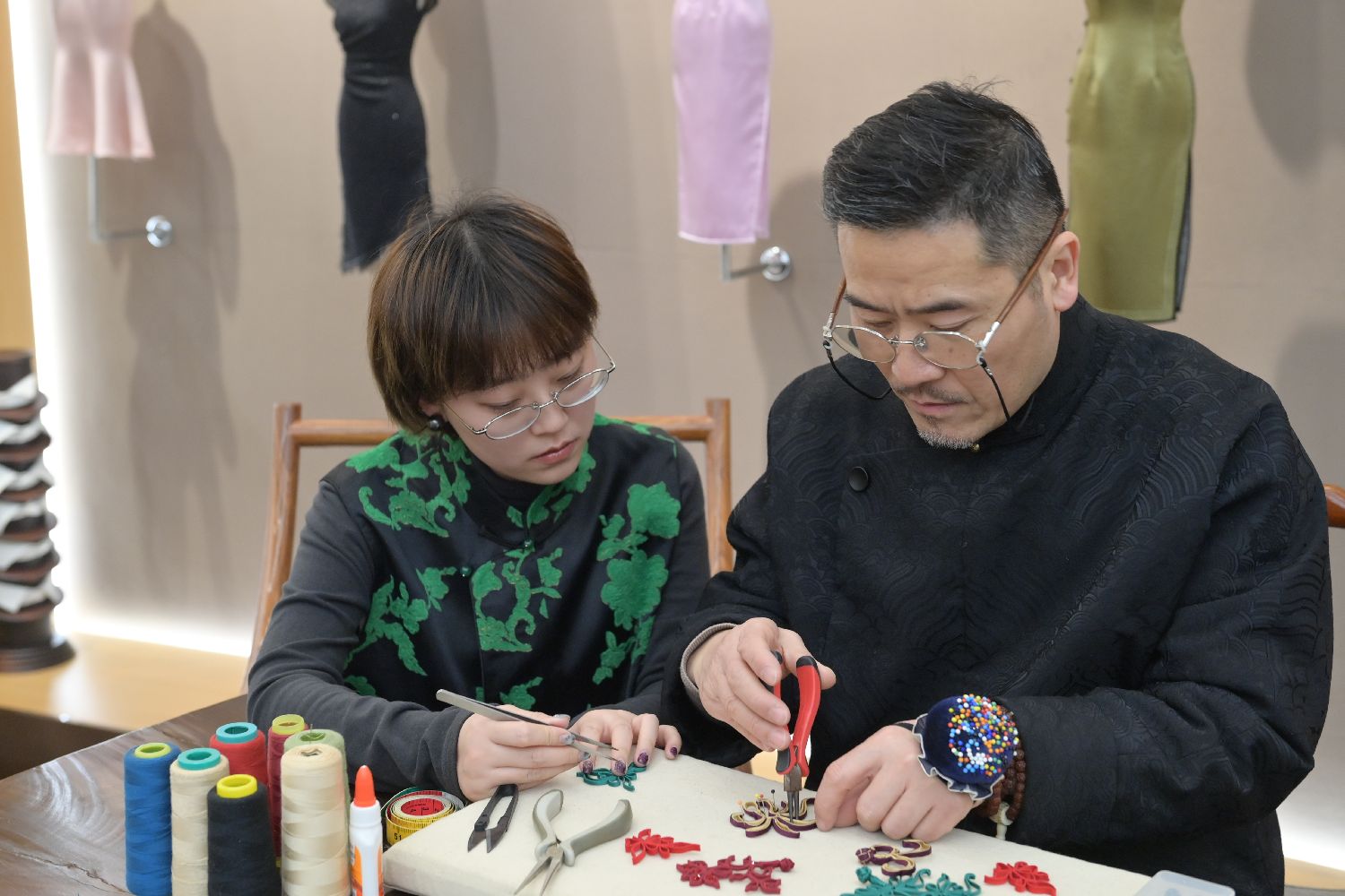 1月20日,安徽合肥的“徽帮裁缝”店内,王俊在教女儿王书仪制作盘扣。(图片来源:中新社)