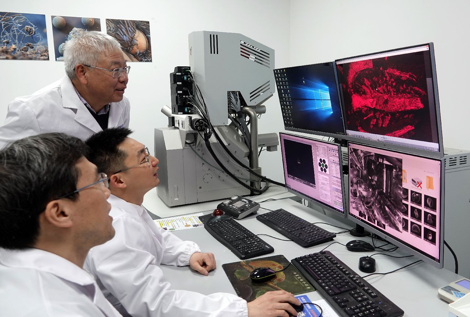 中国科学院南京古生物所朱茂炎院士、曾晗副研究员、赵方臣研究员(由远及近)在实验室讨论交流。(图片来源:中新社)