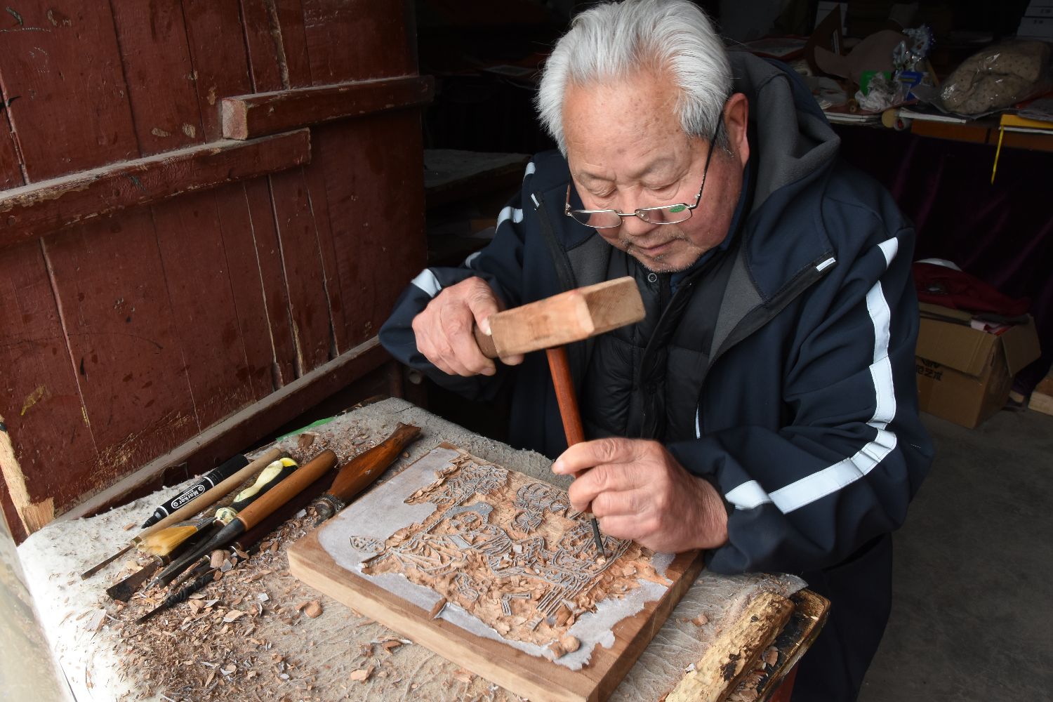 2月5日,河南开封朱仙镇木版年画“万同老字号”第四代传人张连生正在进行木版雕刻。(图片来源:中新社)
