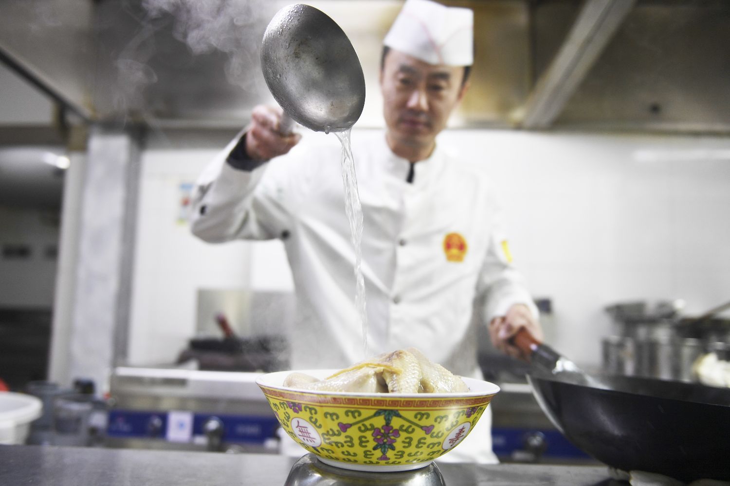 2月5日,吉林石光酒楼的后厨里,厨师烹饪“满族八大碗”菜品小鸡榛蘑粉。(图片来源:中新社)