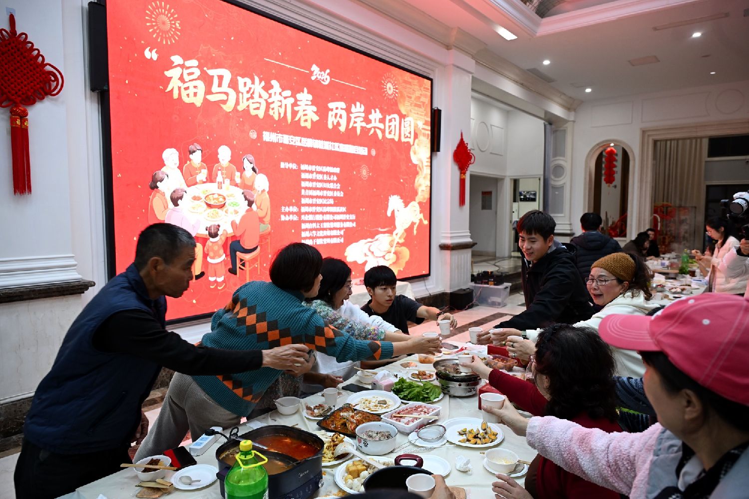 福州芋泥、佛跳墙、台湾香肠……每户家庭都端出拿手菜,台湾特色与大陆各地风味同席飘香。火锅沸腾,笑语阵阵。