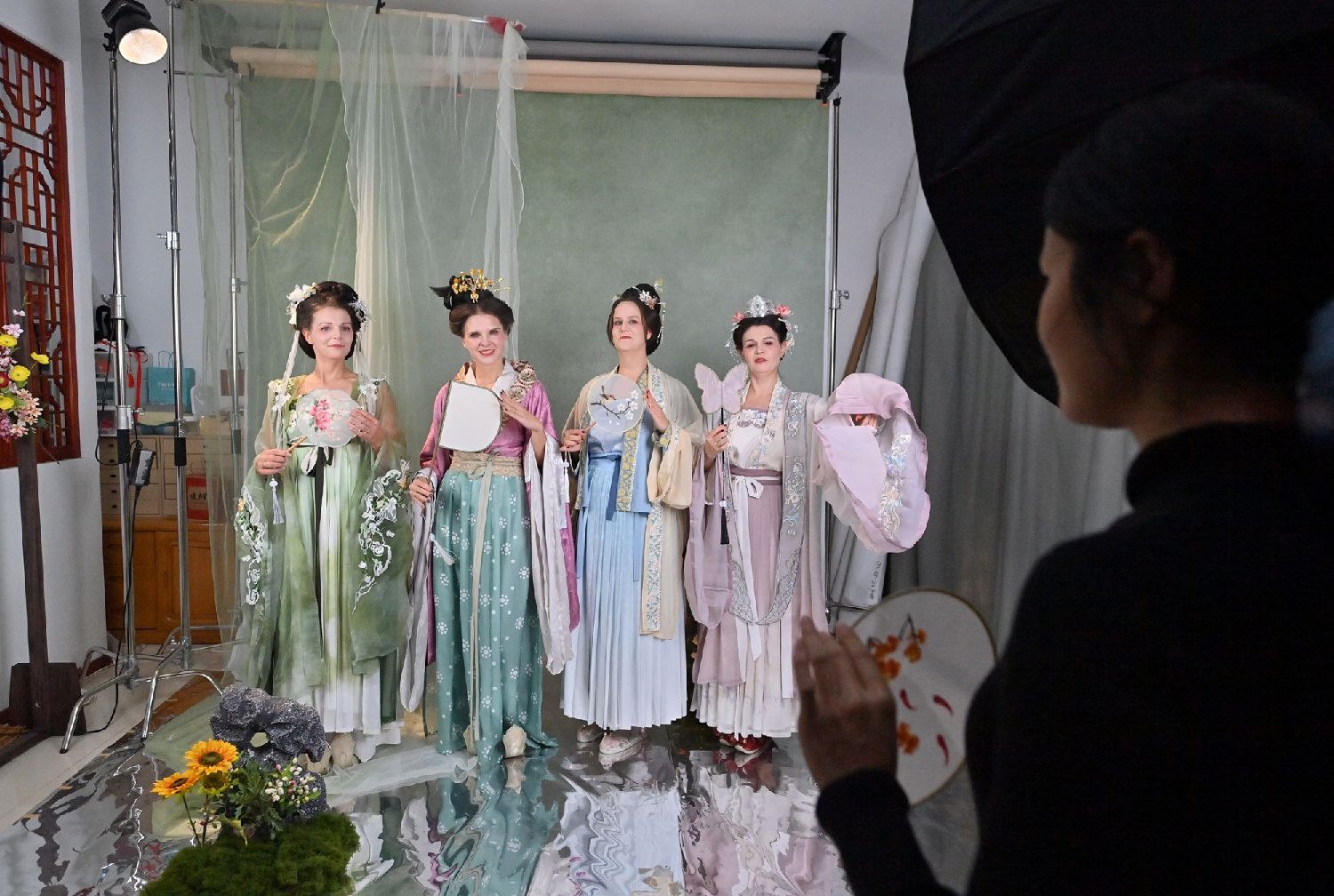 2025年11月9日,在吉林长春的一家汉服体验馆,德国友人身着精美汉服拍摄写真。(图片来源:中新社)