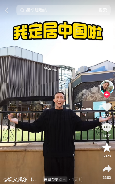 埃文·凯尔在个人社交媒体上发视频称,“我告诉大家一个秘密,我定居中国啦”。他表示,“这(中国)不仅仅是我的第二个家,更是我现在的家。我非常享受这里的生活”。