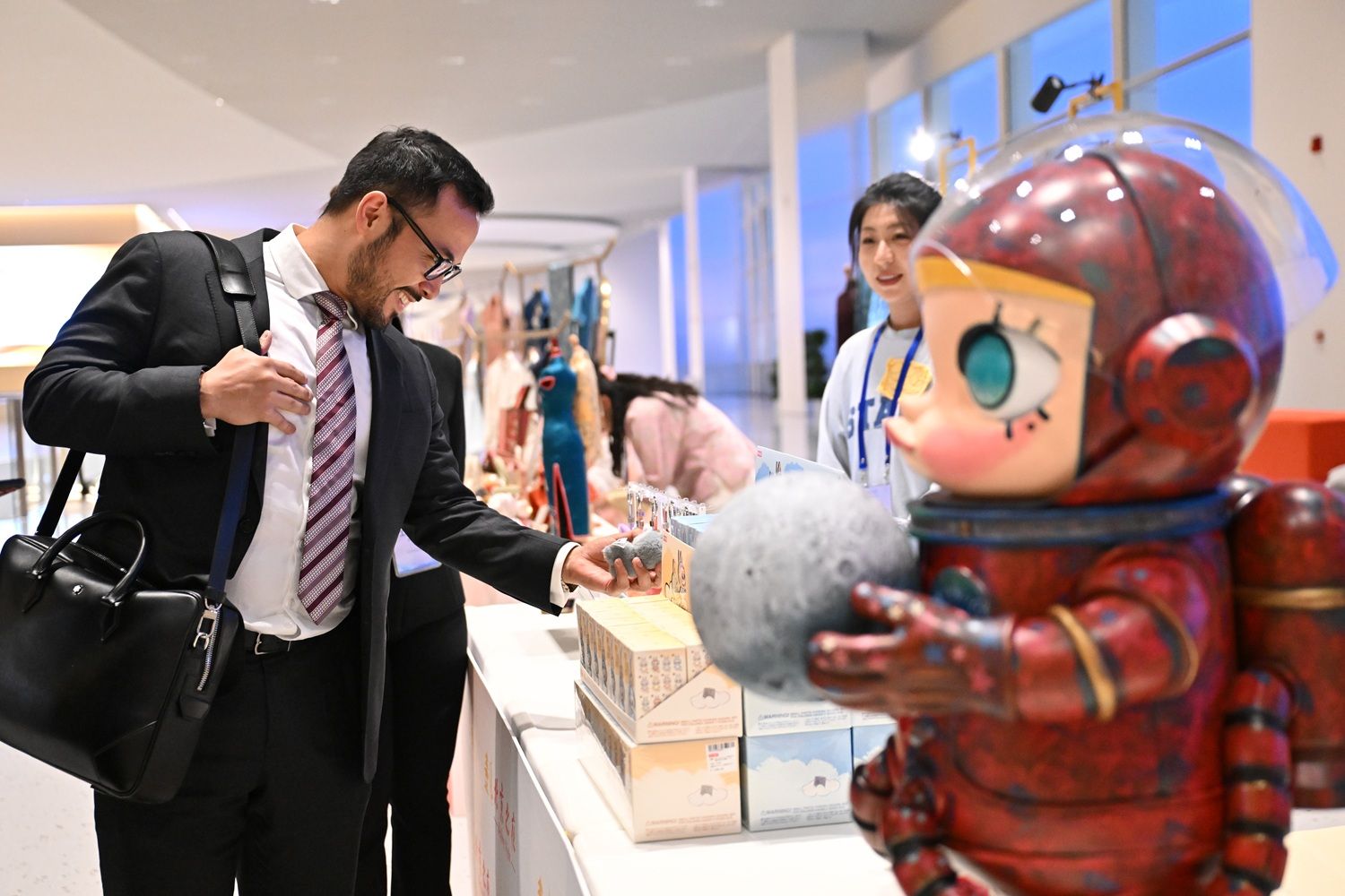 3月22日,中国发展高层论坛2026年年会“北京之夜”活动在北京国家会议中心二期举行。图为泡泡玛特的盲盒产品吸引外籍嘉宾。(图片来源:中新社)