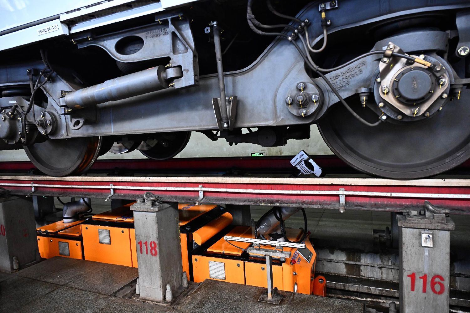3月25日,位于福建省福州市的福州南动车所内,智能检测机器人正对动车组底部零部件进行全方位扫描。智能检测机器人34分钟即可完成一列动车组车底扫描,整体作业效率提升40%。(图片来源:中新社)