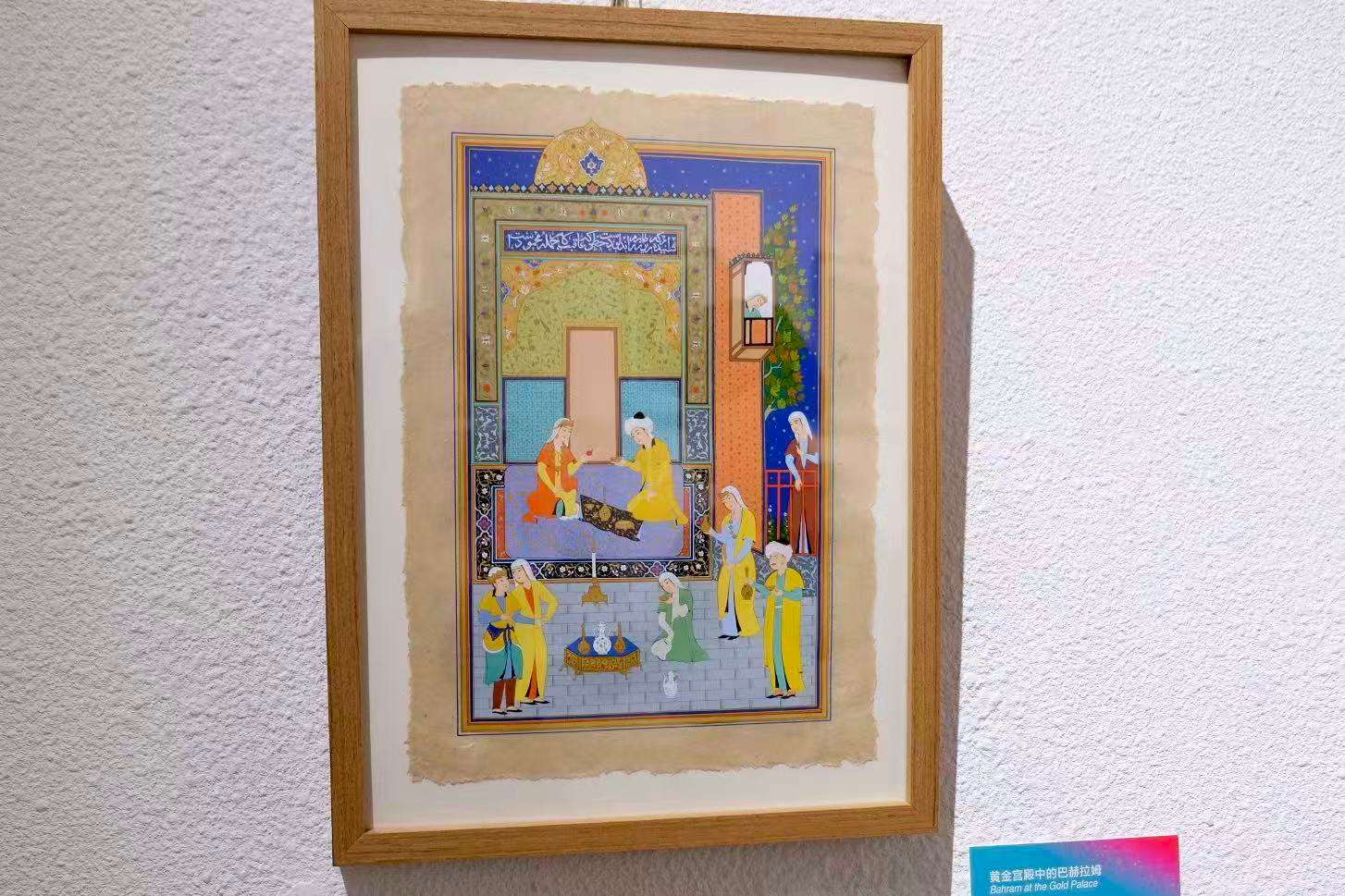 展厅中的乌兹别克斯坦作品《宴会》描绘了一场发生于宫廷花园中的宴会,这是传统东方细密画中反复出现、富有象征意味的主题。画面中,宴会的核心人物端坐于华美帐篷下,乐师、侍从与宾客依次展开,礼仪、身份与集体关系被有序呈现,构成了东方审美中的平衡与节制之美。