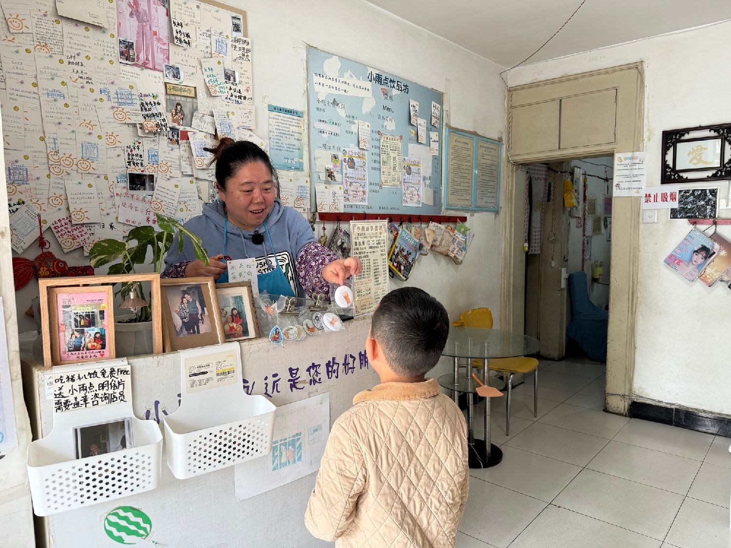 走进“小雨点”饮品坊,吧台上的一行字“小雨点永远是您的好朋友”十分醒目,落地置物架上书胜利和张聪敏的合影从青年到老年,整齐摆放,还有漫画像、与客人的合照……定格了这对台湾夫妇经营小店的日常。