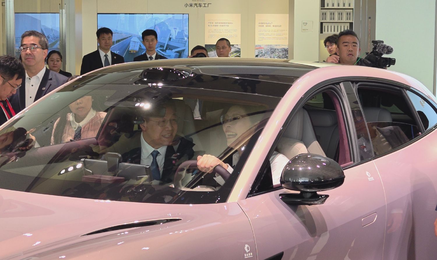 小米集团合伙人、总裁卢伟冰向郑丽文一行介绍了小米公司的发展情况,以及小米汽车的摩德纳技术架构等。在展厅里一台淡粉色的小米YU7型汽车前,郑丽文受邀上车体验,了解车辆的各项功能。