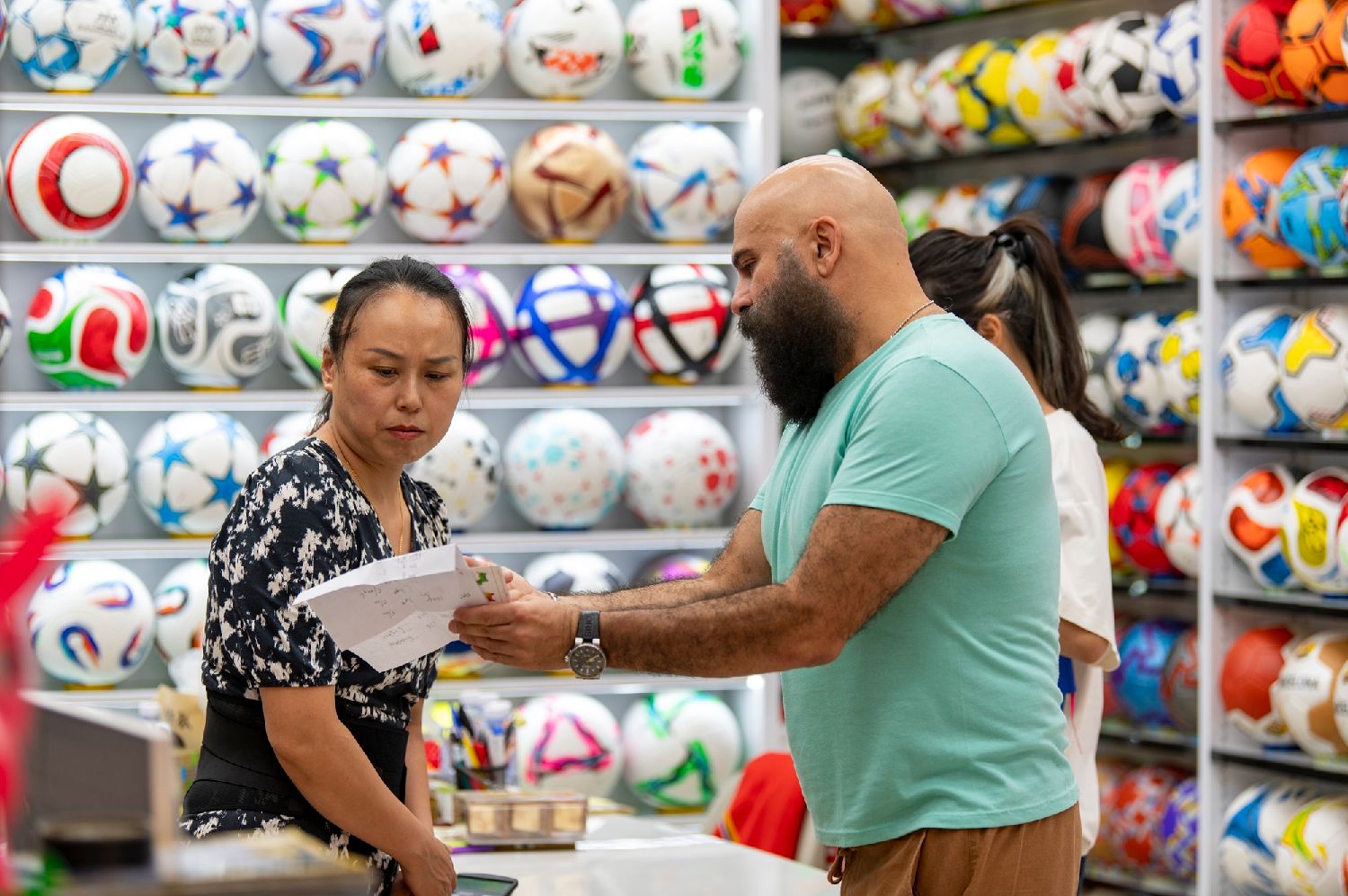 义乌国际商贸城三区,做足球生意的吴晓明同样忙得脚不沾地。